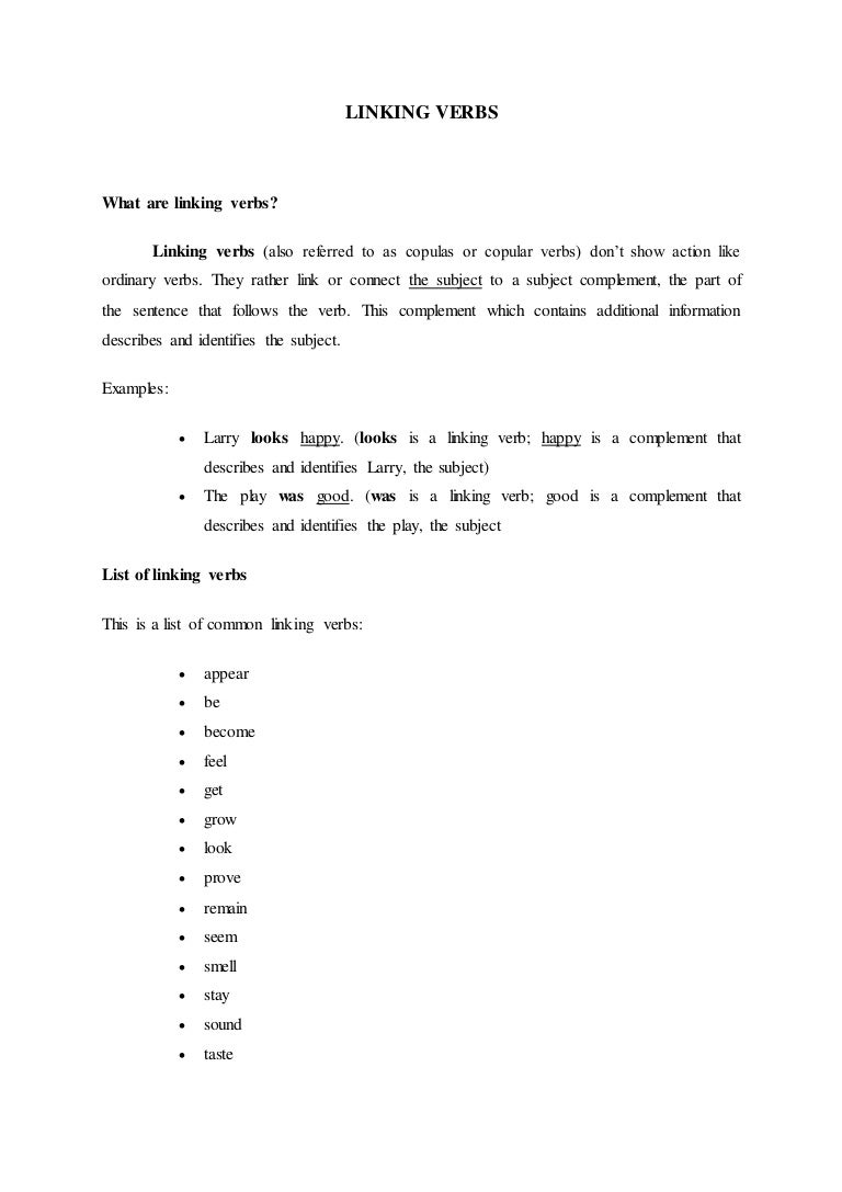 Aside from that, linking verbs allow changing of positions between the subject and the subject complement. Unlike active verbs however, linking verbs do not alter the meaning of the sentence. In today's lesson we will learn about linking verbs. It just links, or joins, the subject of a sentence to a word that identifies or describes the subject, also called the subject complement. Linking verbs, also called copulas or copula verbs, connect the subject of a sentence with an adjective, noun, or descriptive phrase.